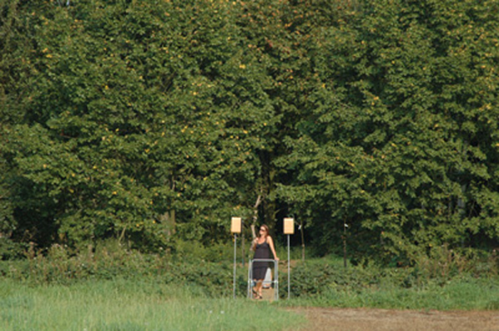 installation with audio-track, lookoutplatform, landscape and mobile chair -