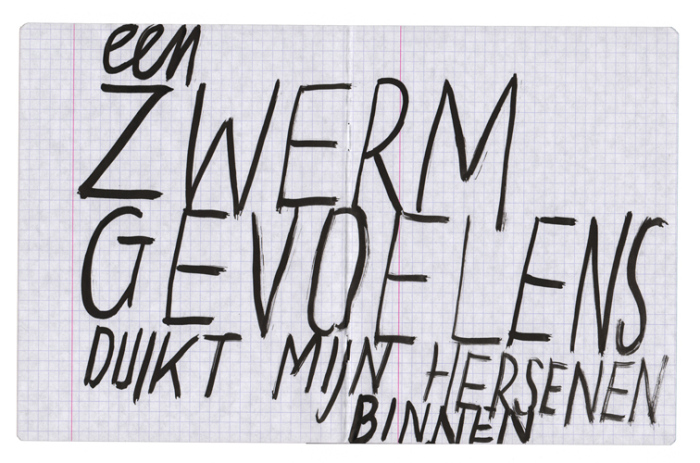 Point Blank Press is a bureau for ‘immediate language’ with Peter Morrens as his only employee. He writes comments or protests with ink and pen on papers from traditional schoolbooks with or without margin.The words concentrate sometimes on the art and address the spectator, based on the heavy presupposition ‘language = saboteur’.